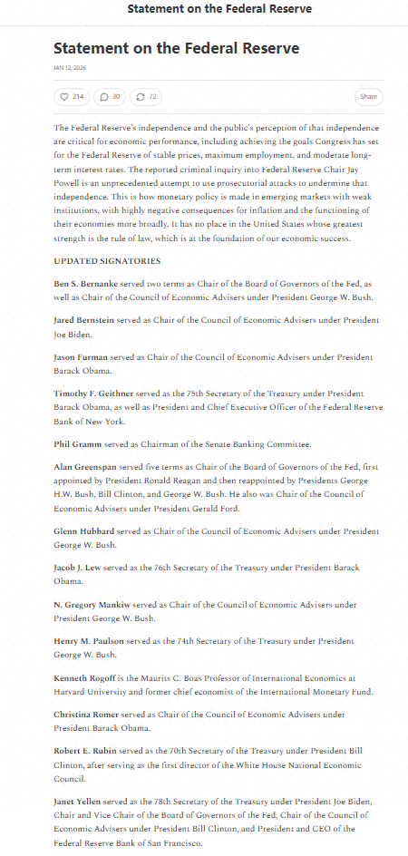 他们共同签署了一份联合声明,以声援鲍威尔。他们写道:“有关对美联储主席鲍威尔展开刑事调查的报道,是试图通过检察手段破坏央行独立性的前所未有之举。”