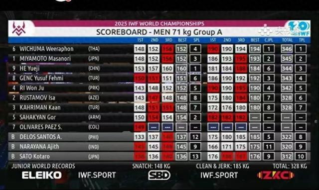 随后的比赛中,土耳其选手根茨、日本选手宫本正典和泰国选手维楚玛先后举起192公斤、193公斤和194公斤,三次改写挺举世界纪录,分列挺举项目前三名。