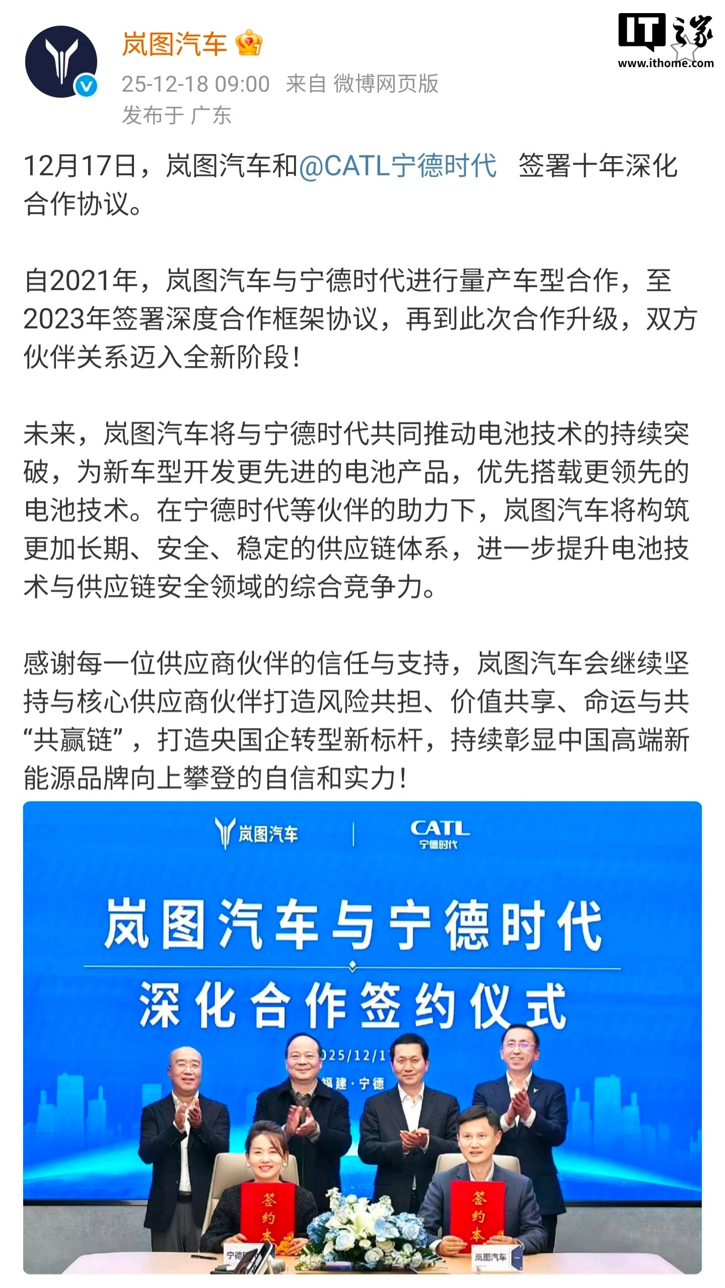 IT之家 12 月 18 日消息融智和,12 月 17 日,岚图汽车和宁德时代签署十年深化合作协议。